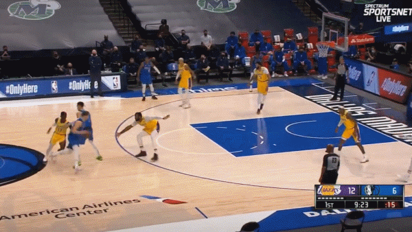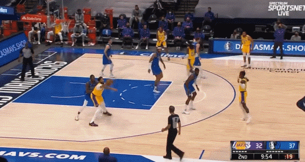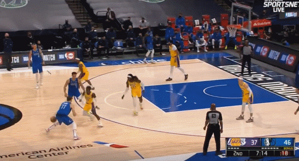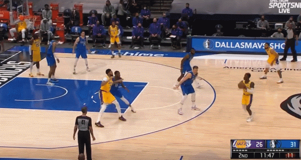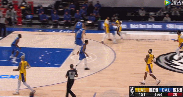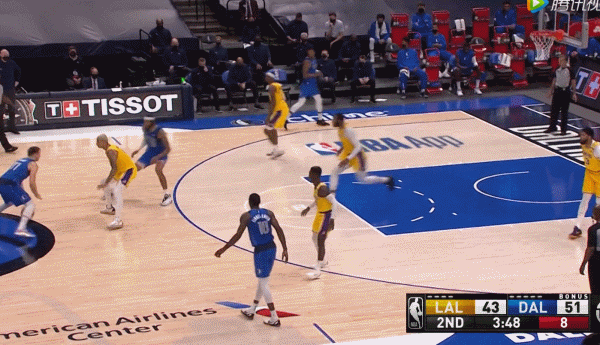 **戴維斯本人的球場感覺不好,也讓他在防守時出現漏人現象。**比如盧卡的這次擋拆,湖人設定的套路是兩人對他圍堵,放掉掩護人,由籃下中鋒去補。但是當鮑威爾殺進來時,戴維斯還在補內線和防外線接球之間猶豫。