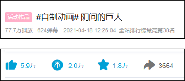 截至本文發稿時,B站《陰間的巨人》已經有70多萬的播放量,點贊投幣也在數萬以上。