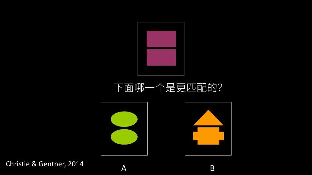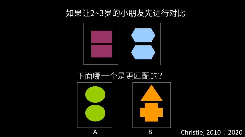 可能成人會説A更匹配,因為A有相似的模式,但是結果顯示,兩歲和三歲的小孩,他們的答案是隨機的,有時候他們選A,有時候他們選B,就是説他們看不出相似的模式。