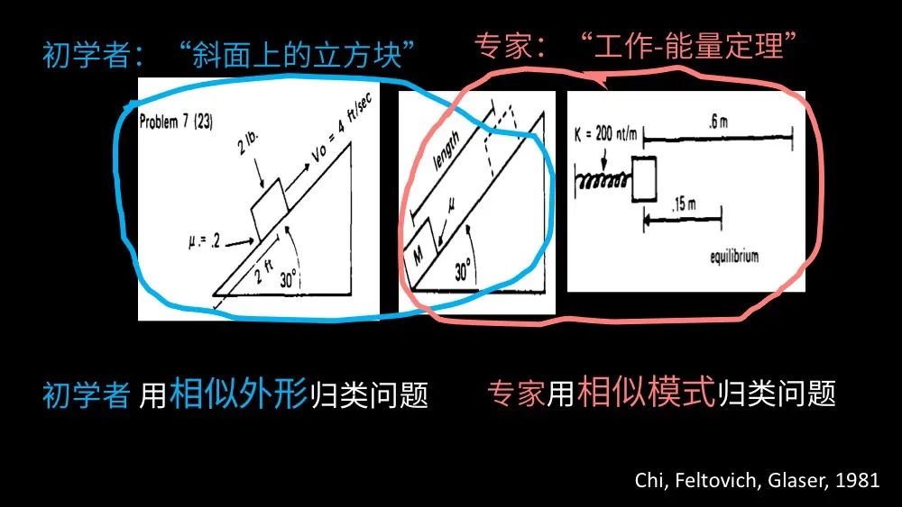 在這個實驗中,成人被邀請對物理問題進行歸類。初學者是這樣歸類的:他們用相似的外形來歸類問題。但是物理學專家是用相似的模式來歸類問題。所以類比思維是不簡單的,一開始還是很難的。