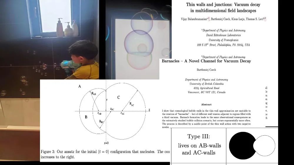 上星期我的孩子玩吹泡泡,然後他突然問,為什麼有一些泡泡不一樣,是奇奇怪怪貼在一起的?他爸爸是物理學家,聽到這個問題很興奮,跟孩子説:這個問題很不簡單,其實我也研究過泡泡的形狀,用來解決一個宇宙學的問題,我還寫過兩篇文章。