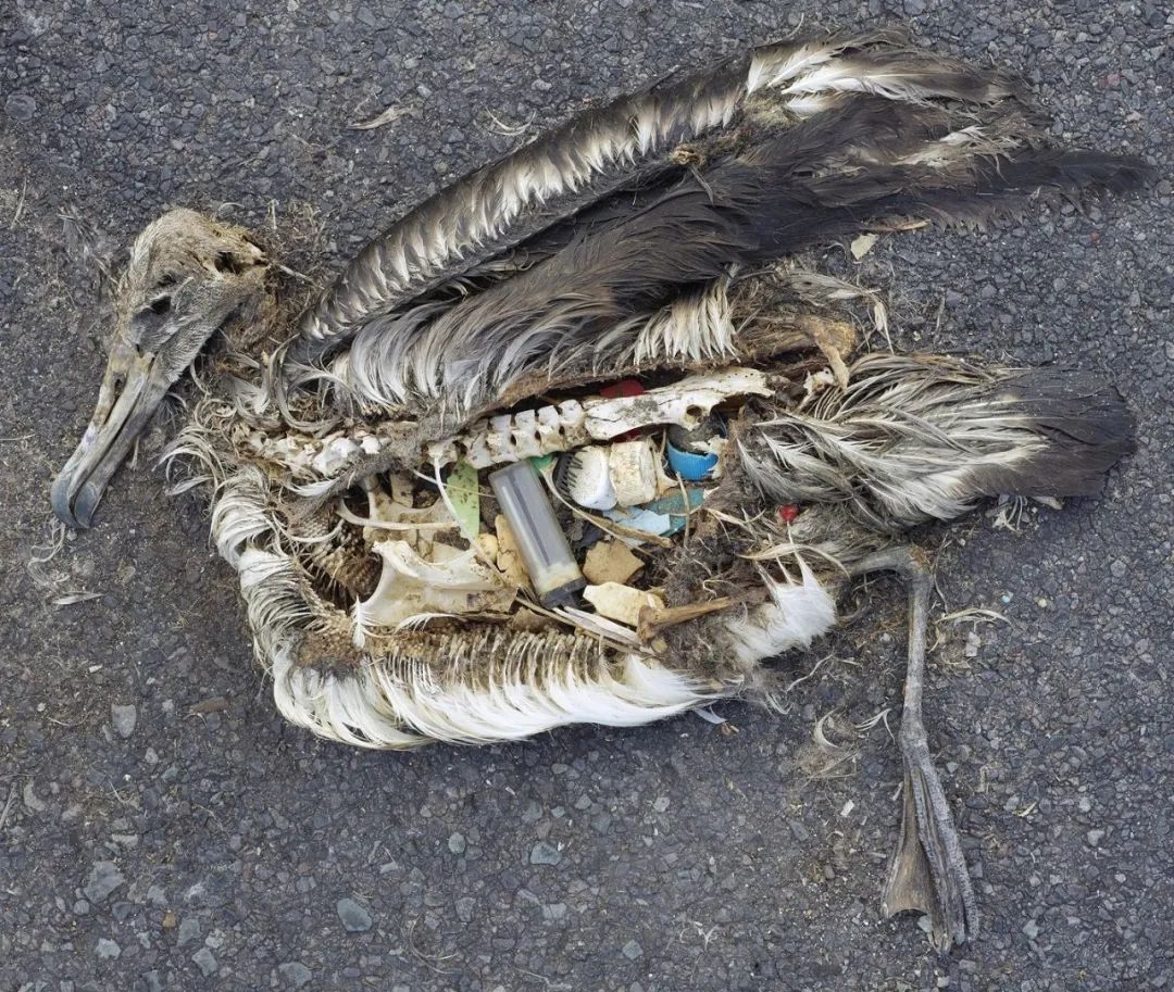 在太平洋中途島,一隻死去的信天翁雛鳥,它的胃中含有雌鳥給雛鳥餵食的塑料垃圾。當然鳥也會吃正常的食物,例如魚,但在魚的體內也發現有塑料碎片。