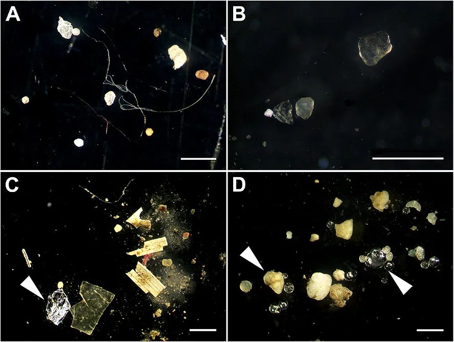 (德國河流中發現的塑料顆粒,白色條表示刻度1毫米)