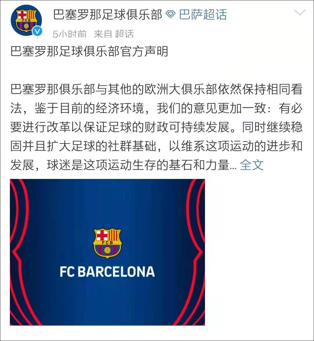 巴塞羅那俱樂部與其他的歐洲大俱樂部依然保持相同看法,鑑於目前的經濟環境,我們的意見更加一致:有必要進行改革以保證足球的財政可持續發展。同時繼續穩固並且擴大足球的社羣基礎,以維繫這項運動的進步和發展,球迷是這項運動生存的基石和力量。