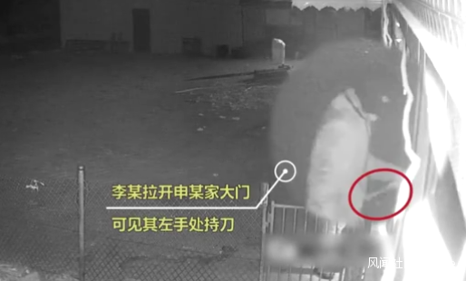 根據監控視頻顯示,當時李某戴着頭套,僅露出一雙眼睛,手持手電筒,徑直走向申某家中。而在其拉開申某家大門時,左手拿着的刀清晰可見。