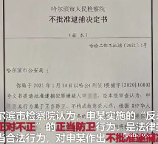 最終,通過補充偵查和公開聽證,經檢察委員會討論研究,哈爾濱市檢察院認為,嫌疑人申某的行為不構成故意殺人罪,其實施的“反殺行為”屬於正當防衞行為,是受法律保護的,因此對申某作出不批准逮捕決定。