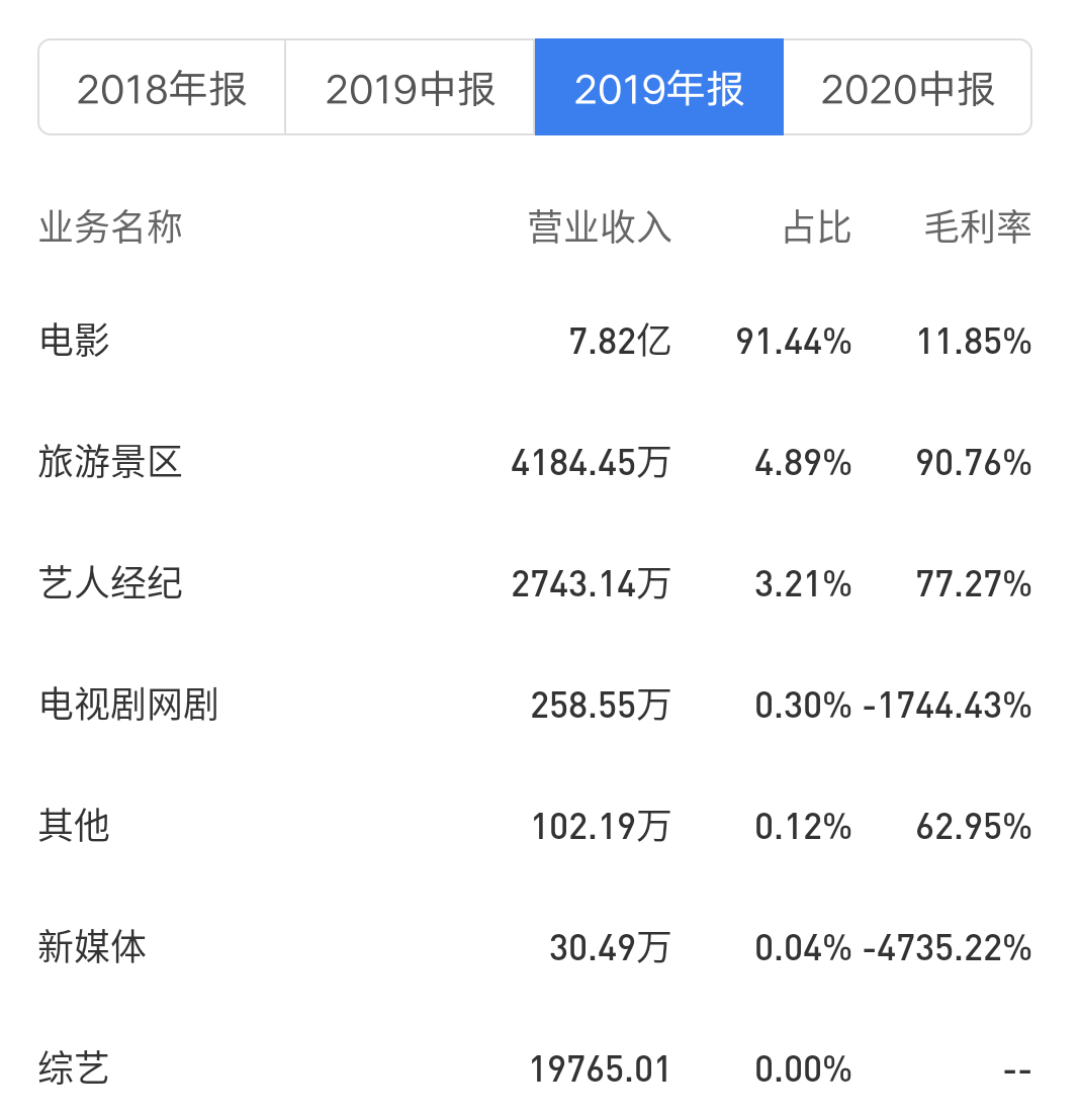 從電影電視劇各佔半壁江山到電影業務一枝獨秀,影視業務顯然已經成為北京文化未來重點着力的領域,但是值得注意的是,2019年財報顯示,北京文化佔比高達91.4%的電影業務毛利率僅為11.85%。相比之下,光線傳媒2019年影視及衍生品的毛利率高達45.83%;華誼兄弟2019年影視娛樂的毛利率為24.95%。