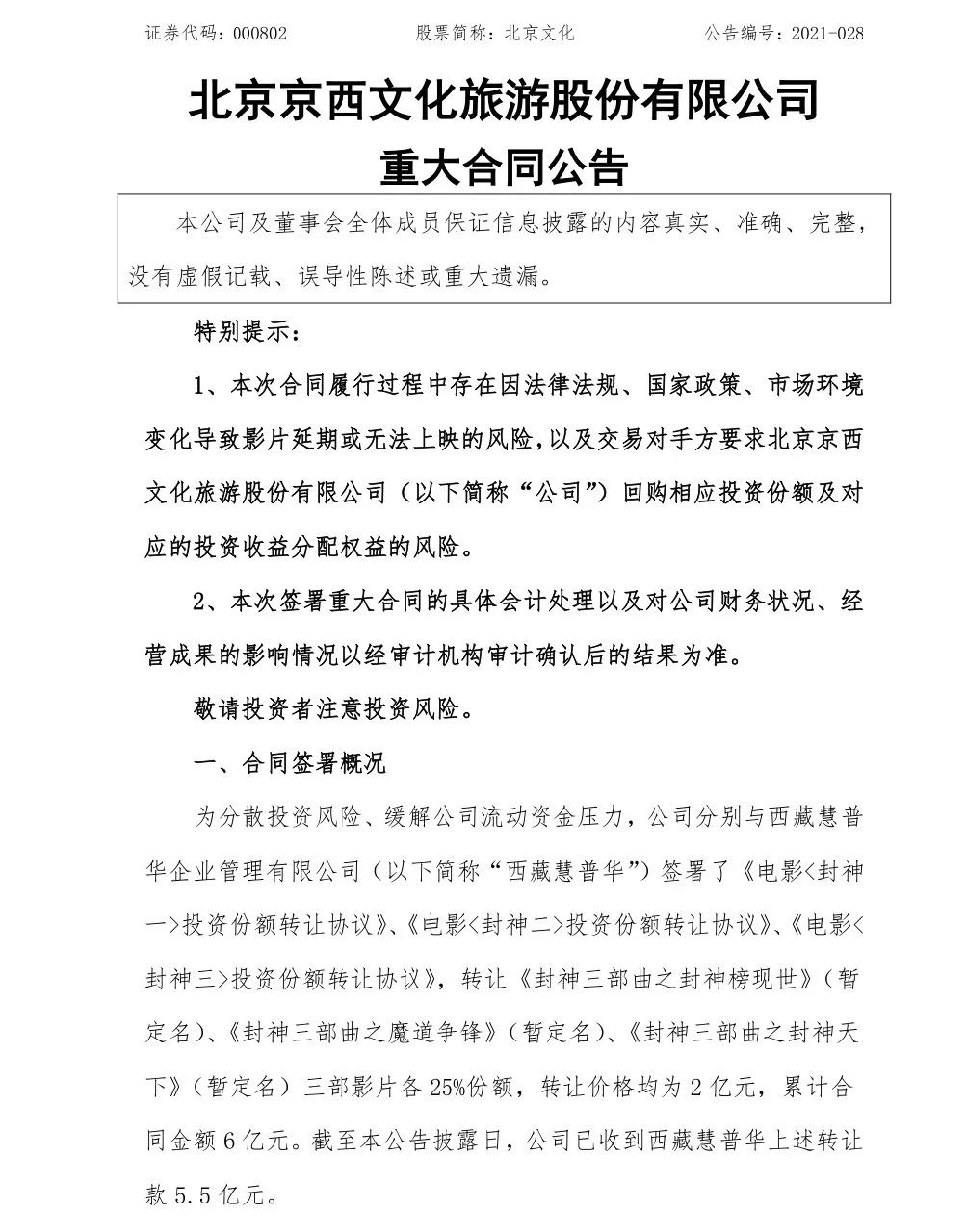 4月21日,北京文化公告稱,公司與西藏慧普華企業管理有限公司簽署了《電影投資份額轉讓協議》,轉讓《封神》系列三部電影各25%份額,轉讓價格均為2億元,累計合同金額6億元。截至公告披露日,已收到轉讓款5.5億元。