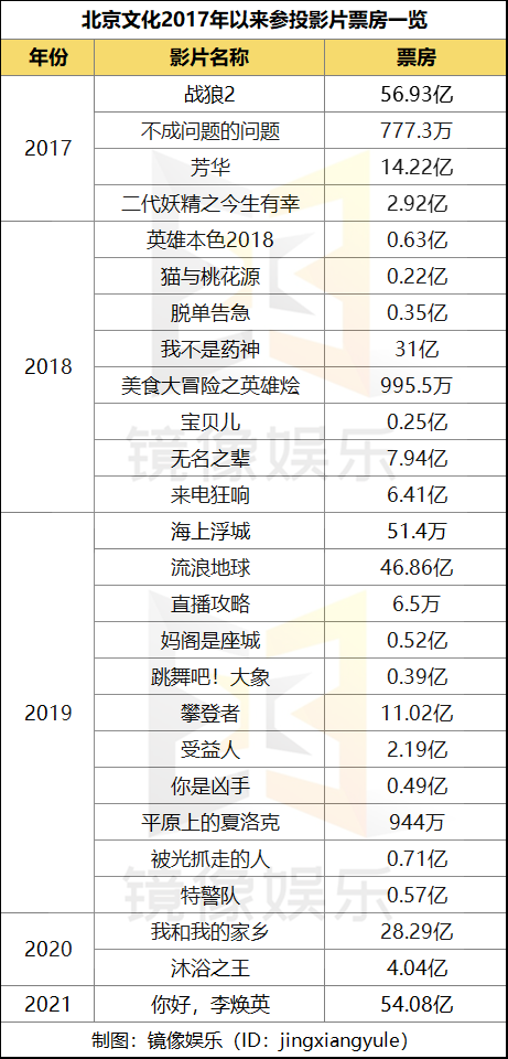 究其原因還在於儘管北京文化參與出品了《戰狼2》《流浪地球》《你好,李煥英》等爆款電影,但是北京文化從這些爆款電影中能夠拿到的利潤有限。