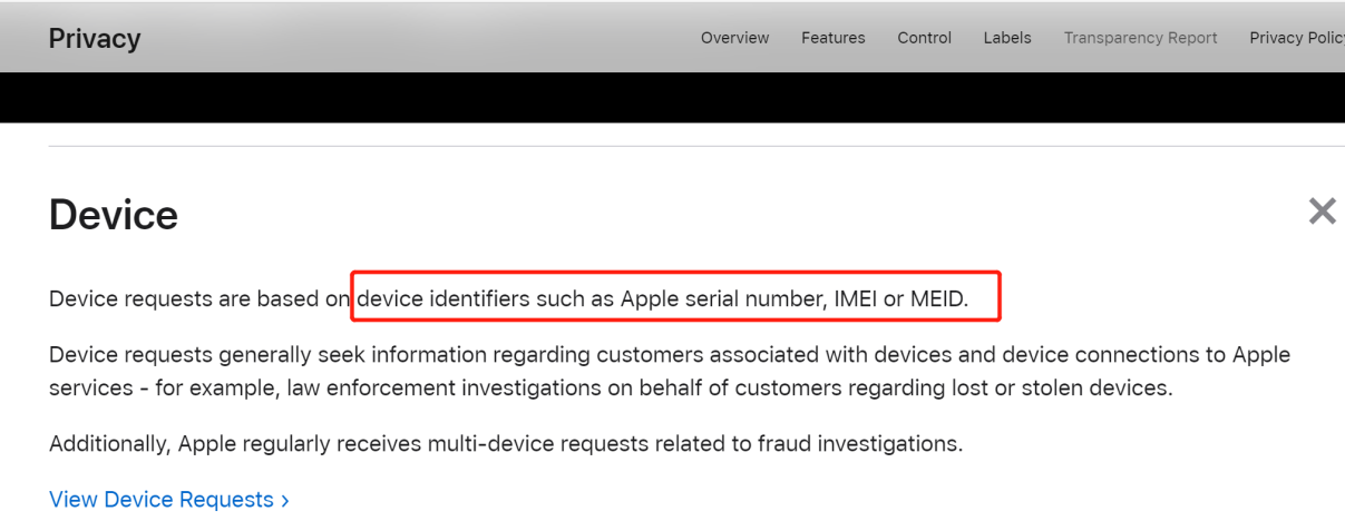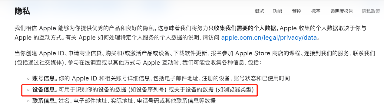 **首先,就設備數據的獲取與使用,蘋果明顯存在歧視性的雙重標準。**一方面,蘋果《隱私政策》表明,其將收集包括設備序列號、IMEI或MEID等在內的用户設備信息,並可將其用於數據分析、推銷Apple產品和服務、與合作伙伴共享等目的。而另一方面,《蘋果開發者計劃許可協議》第3.3.9條卻禁止app讀取設備標識符,並且不允許app基於設備標識符衍生的任何數據來永久識別設備,還禁止app發送設備數據給第三方進行數據分析。