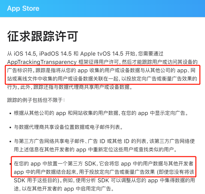 2020年6月,蘋果在WWDC開發者大會宣佈,將在iOS14及後續系統中啓用ATT框架(App Tracking Transparency,蘋果系統默認的授權彈窗),限制應用讀取用户設備的廣告標識符IDFA,以保護用户隱私。蘋果IDFA新政的主要變化即在於,此前在系統層面默認開啓的IDFA權限將下沉到應用層面,且默認關閉。蘋果此舉意味着一旦用户拒絕授權,精準營銷就將徹底喪失生命力。