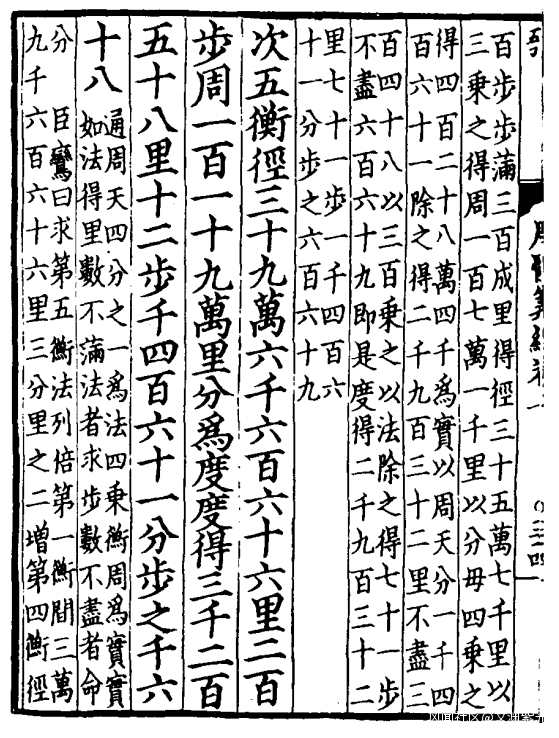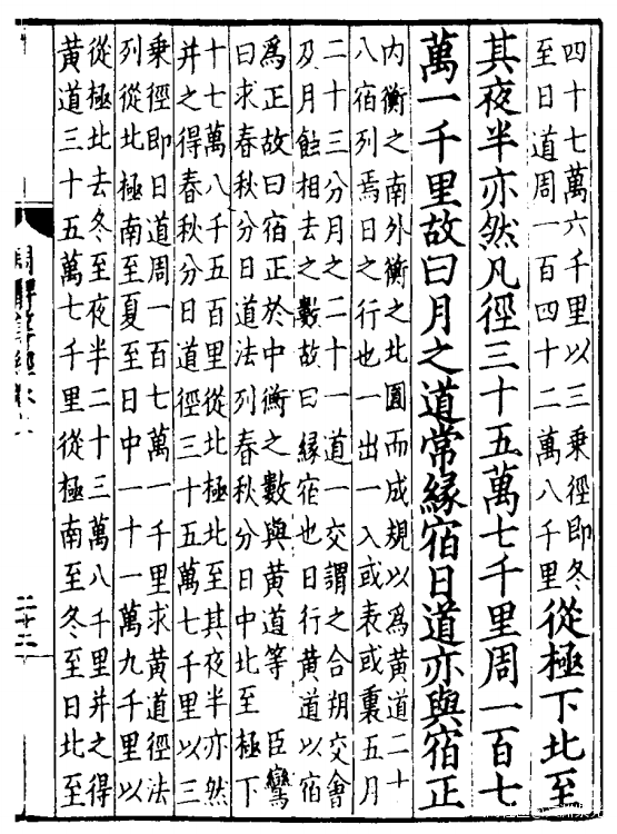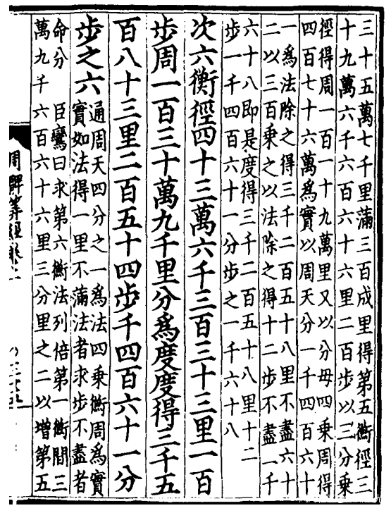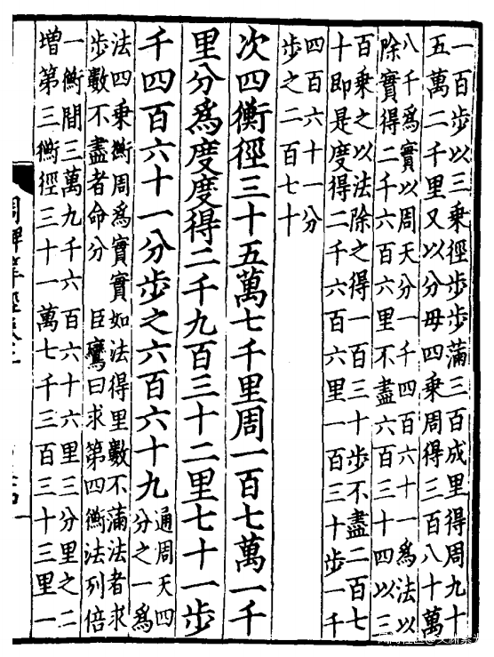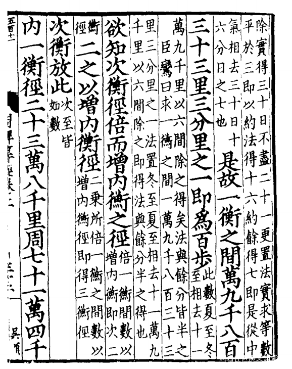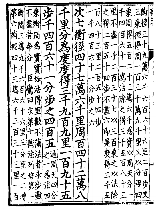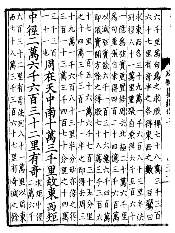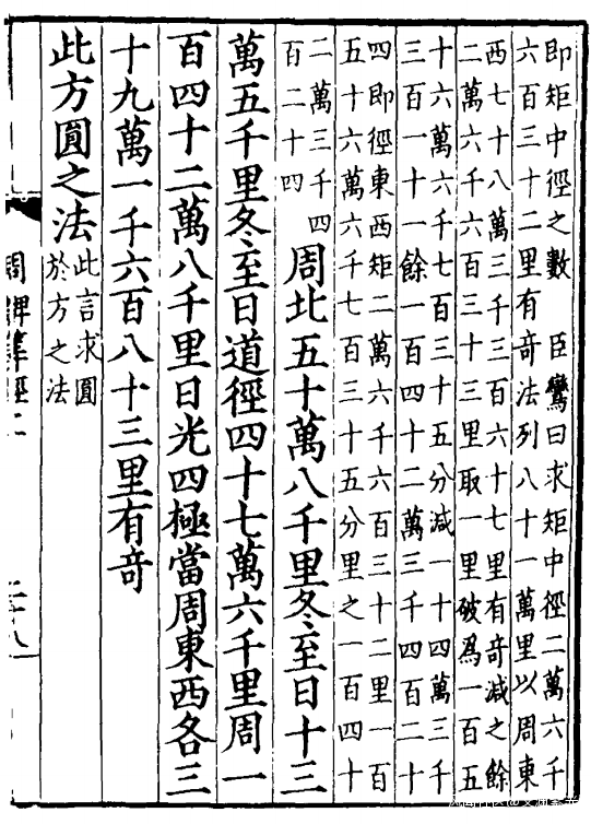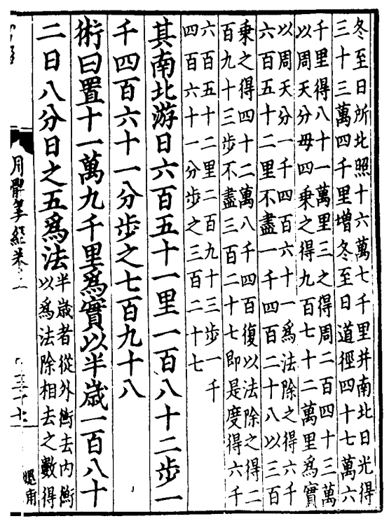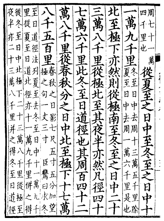 《周髀算經》説夏至日太陽距北極星的距離是 119000 裏,而在半夜太陽就運行到北極星的對面 , 距離北極星的距 離 也 是119000 裏, 這樣夏至日的日道軌跡直徑就是 119000+119000=238000 裏,日道軌跡周長714000 裏(直徑乘以 3)。 同理春秋分日的日道軌跡直徑(119000+59500)×2=357000 裏,日道軌跡周長 1071000 裏;冬至日的日道軌跡直徑 (119000+119000)×2=476000 裏,日道軌跡周長 1428000 裏。