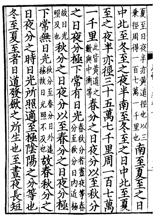 “春分之日夜分以至秋分之日夜分,極下常有日光。 秋分之日夜分以至春分之日夜分, 極下常無日光。 故春秋分之日夜分之時,日光所照適極,陰陽之分等也。 ”訛輯輥從春分到秋分能觀察到極地是有光的, 而從秋分到春分則看不到極地, 這個現象説明在春秋分之日,太陽光剛好照射到極地的邊緣。 於是它説“故曰:日照四旁各十六萬七千裏”訛輰輥。 那麼這個日光的照射距離是怎麼測算出來的呢?