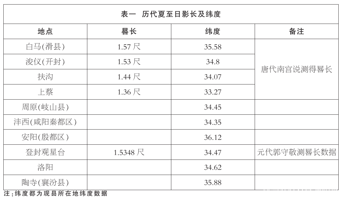 《周髀算經》中經典的量天尺——寸影千里,在歷代都備受關注,也是爭論的焦點。寸影千里產生誤區的根源在於古人建立宇宙模型時所採用的平面幾何的建構模型,把地面構建成一個統一的大平面, 只有在統一的大平面下才能採用勾股定理來測量和測算宇宙。 而事實上地球是圓形的,大地平面是個弧形面 而不是用幾何原理構建出來的平面, 因此在實地尤其是大距離的測量上肯定是測不準的, 也必定是不準確的。 例如後世《隋書·天文志》對“寸影千里”提出了疑義,而到了唐代,“開元九年(721),天文官幾次預測日食不準,玄宗下詔讓僧一行(673~727) 制訂新的歷法。 ……天文學家南宮説等人在河南進行的日影測量工作最為重要。 南宮説等在黃 河 南 北 選 擇 了 幾 乎 位 於 同 一 經 線 的 白 馬(今河南滑縣)、浚儀(今河 南 開 封)、扶 溝 和 上蔡這四個地點, 分別測量了其北極出地高度和夏至日影長度”。 測得的數據如表一。
