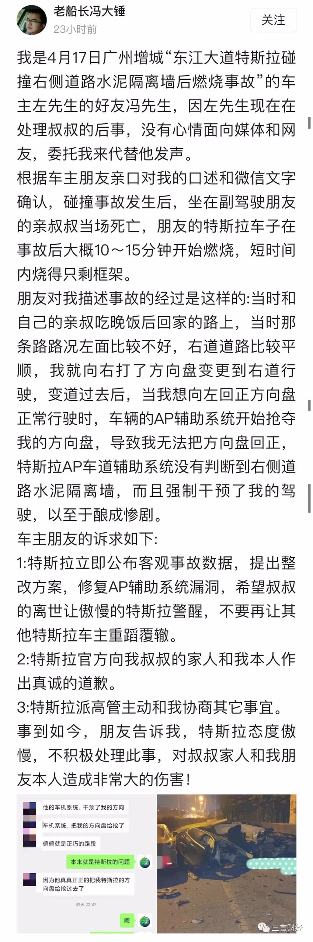最後車主還要求特斯拉派高管主動和其協商其它事宜。“事到如今,朋友告訴我,特斯拉態度傲慢,不積極處理此事,對叔叔家人和我朋友本人造成非常大的傷害!”