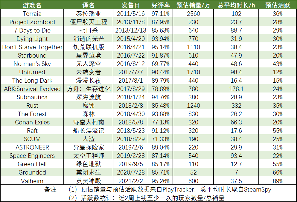 統計範圍依舊為剛才所提到的21個爆款沙盒生存遊戲,從2011年發售的《泰拉瑞亞》,覆蓋到2021年發售的《英靈神殿》,時間跨度為10年。