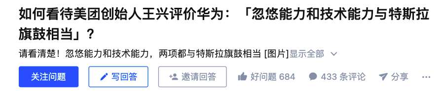 王興在飯否上引用了華為自動駕駛總裁蘇菁的一段話,同時順口評論道:“特斯拉終於遇到一個技術實力和忽悠能力都旗鼓相當的對手了。”
