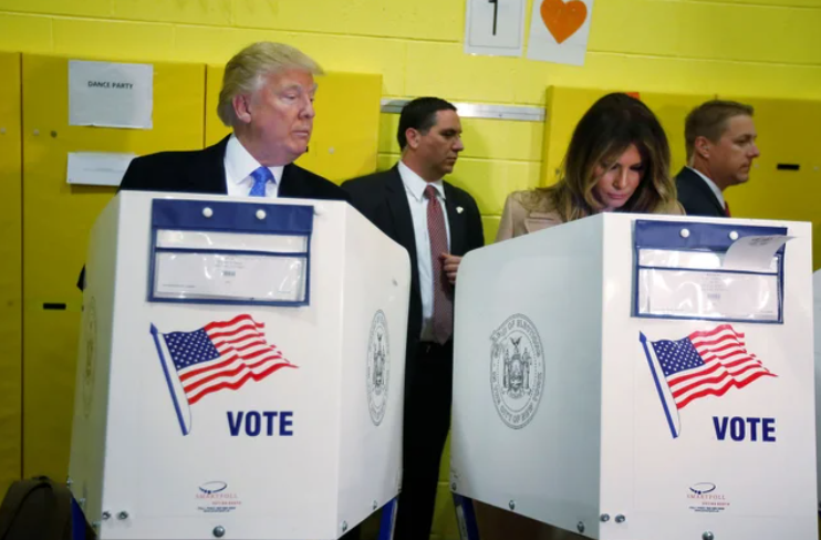 下面是一張曾經在國外網站上瘋傳的照片,懂王跟妻子在紐約投票,在照片中特朗普似乎在看妻子的選票。