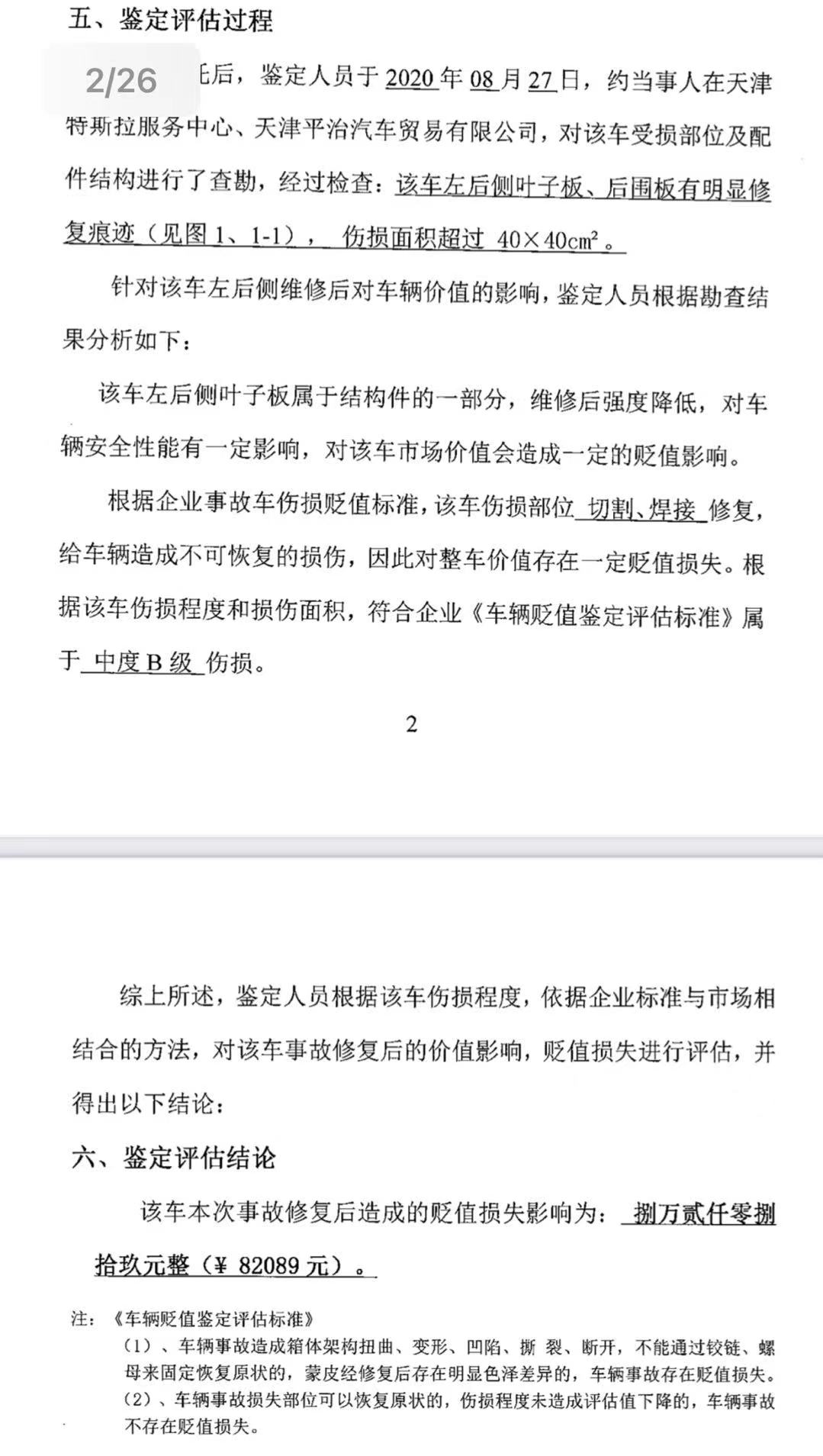 特斯拉方面拒絕認可韓先生單方面提供的《技術鑑定意見書》。經法院組織,雙方同意由北京晶實機動車鑑定評估機構有限公司對涉案車輛進行司法鑑定。最終,鑑定意見為,“該車本次事故維修後造成的貶值損失影響為82089元” “該車後葉子板維修後會對車輛安全性造成一定影響。”