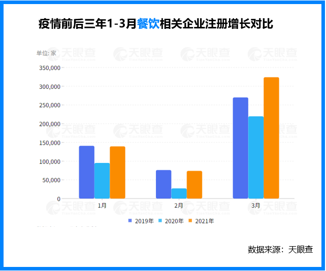 天下熙熙,皆為利來;天下攘攘,皆為利往。餐飲、住宿、影院、旅遊景點、商場百貨……人潮川流不息,蒸騰着市井煙火。報告顯示,2021年1-3月餐飲相關企業註冊量為53.7萬家,比2020年同期同比增長57.1%,較2019年增長10.3%。尤其是在2021年3月,該月註冊量為32.4萬家,創2019年以來新高。