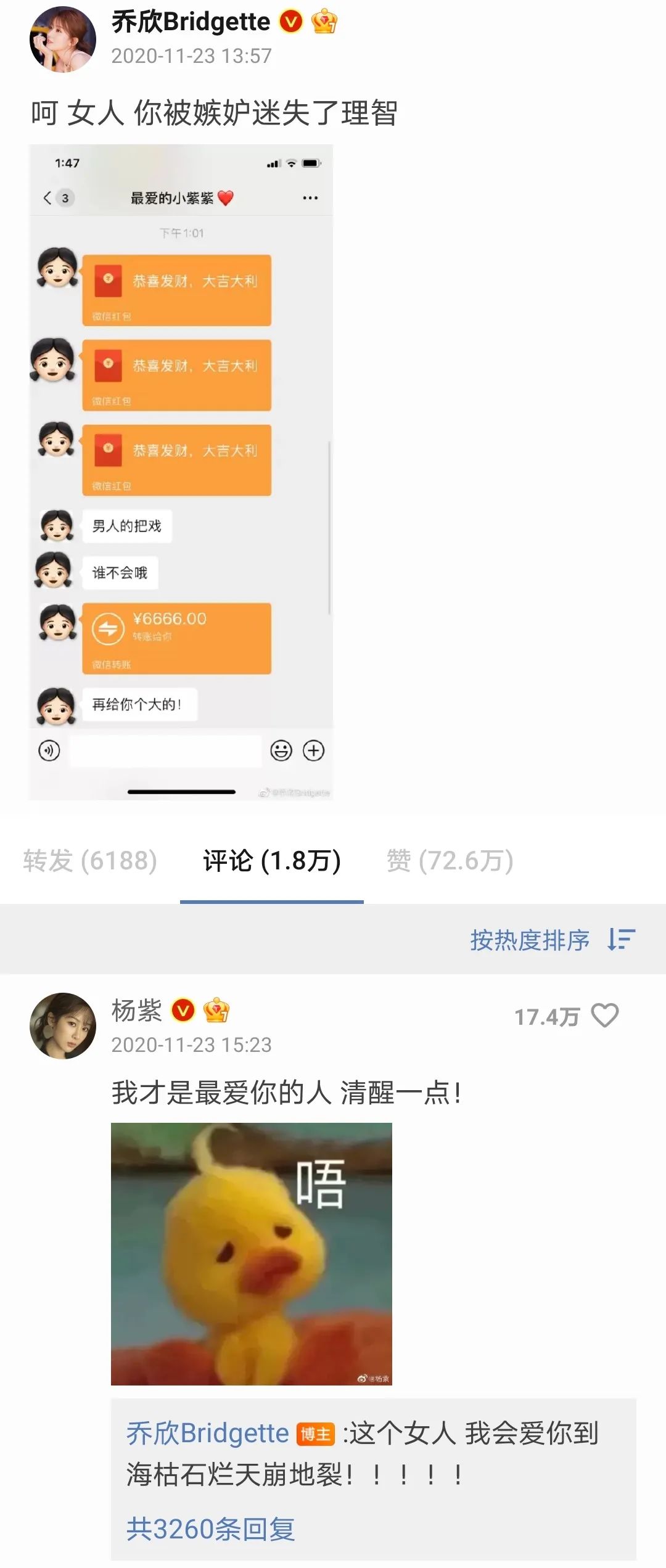 評論區的楊紫“醋意大發”,留下一句:呵,男人的把戲。並馬上追加6666的大紅包,盡顯“霸總本性”。