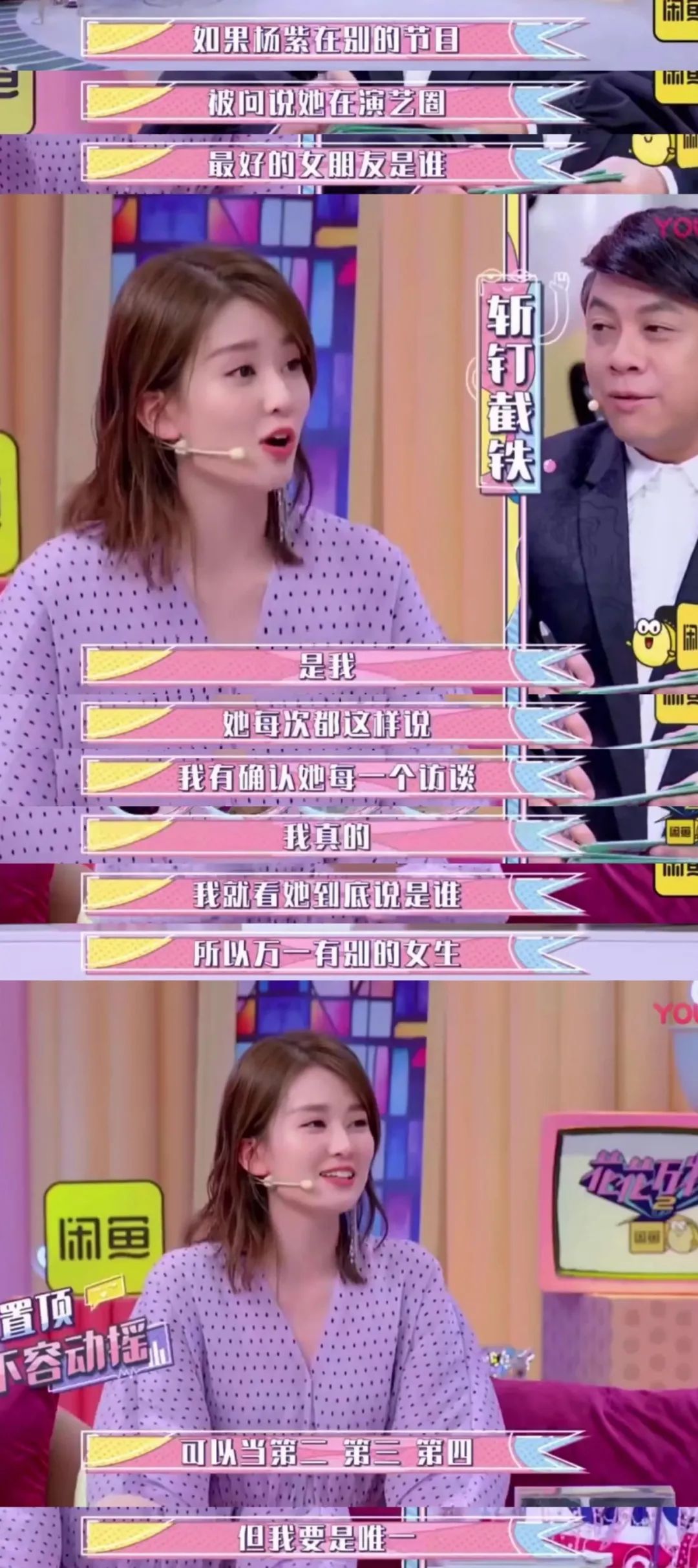 她自己在節目中承認,會悄悄檢查楊紫所有采訪,如果楊紫被問到誰是圈內最好的朋友,必須要是她的名字。