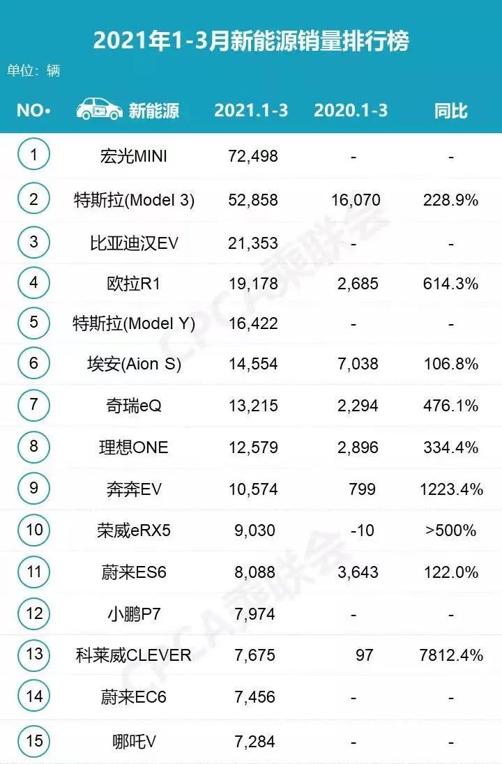 2020年,威馬直接跌到了TOP 4。乘聯會更新的2021第一季度新能源車銷量排行榜TOP 15車型中,已經看不到威馬的身影。取而代之的,是以72498輛銷量遙遙領先的低端車型宏光MINI,和高端的特斯拉、蔚來、理想們。