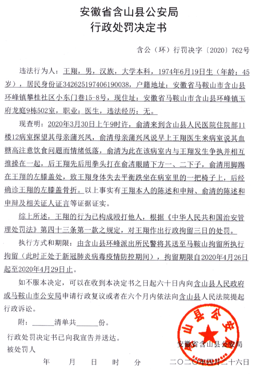 2020年3月,王翔與患者家屬在病房內發生衝突,因在推搡過程中拳頭擊中對方眼部,被含山縣公安局以“毆打他人”為由,判處行政拘留三日,之後馬鞍山市公安局駁回了王翔撤銷行政處罰的申請。