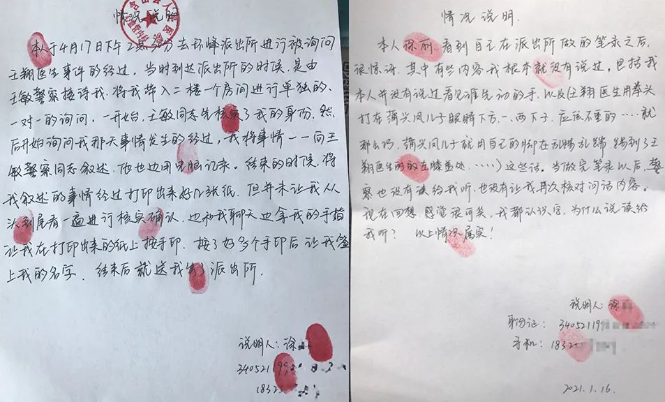 此前王翔在申請行政複議時,公安機關曾表示沒有執法記錄儀記錄。但證人王某稱,自己看到前來辦案的民警配有執法記錄儀,並在辦公室門口隱約聽到民警對俞某説,“這種時候(疫情期間)你還敢打醫生?”