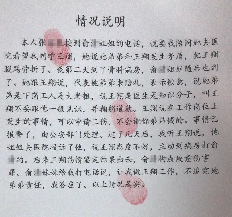 王翔告訴“醫學界”,他本沒想到事情會鬧大。剛受傷入院時,俞某的姐姐曾主動來病房找他賠禮道歉。王翔也直白地告訴對方,自己可以申請工傷,不會向其索賠。但第二天,俞某的姐姐又去投訴了王翔,稱其態度不好。
