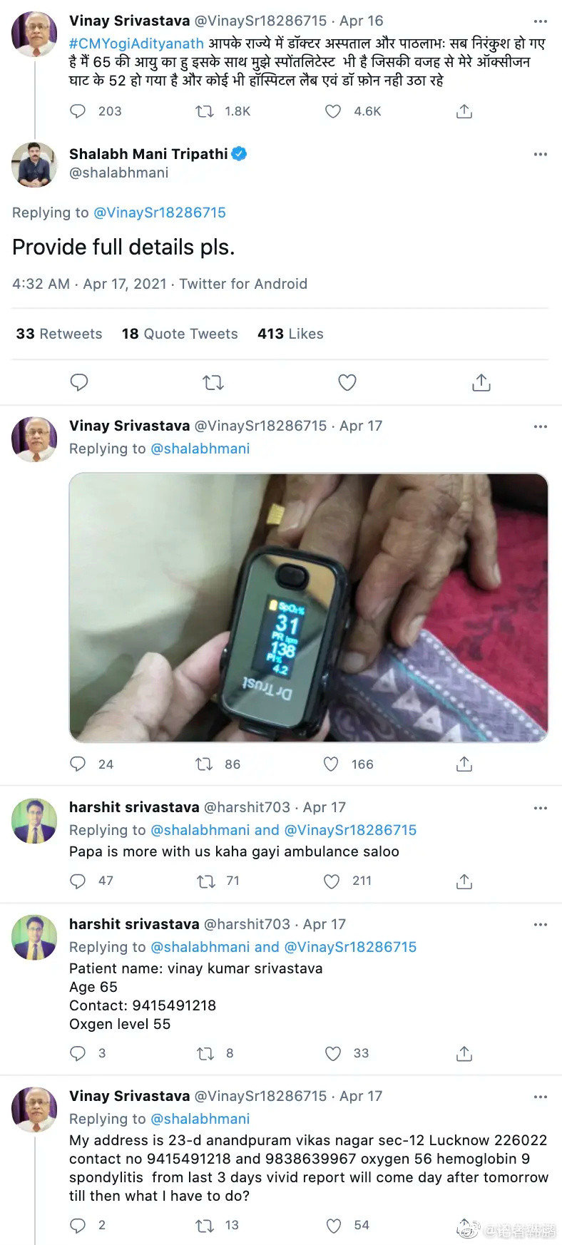 ——記者Srivastava發推:“現在我的血氧31了,還有人能來救我嗎?”