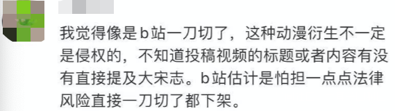 也有網友表示,當初《大宋少年志》上線時不少網友做“自來水”幫忙宣傳,現在一刀切不大合理。還有網友稱,之前有人説只針對拆分視頻,不針對吐槽和二創,現在看來並非如此。
