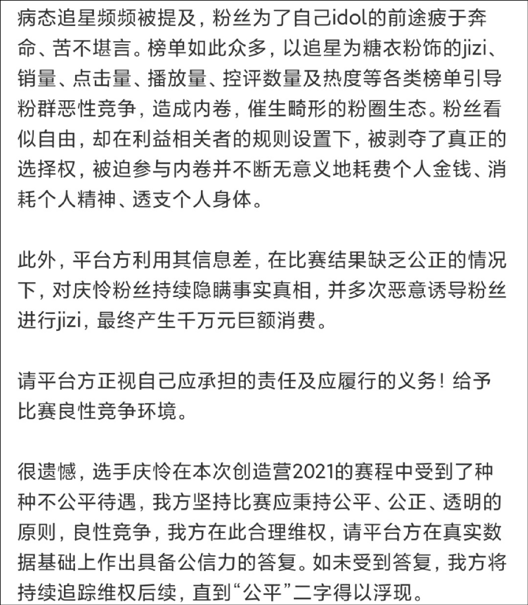 “平台方利用其信息差,在比賽結果缺乏公正的情況下,對慶憐粉絲持續隱瞞事實真相,並多次惡意誘導粉絲進行jizi(集資),最終產生千萬元鉅額消費。”