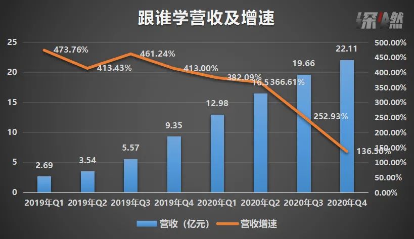 2020年第四季度,高途營收21.11億元,同比增長136.5%;淨虧損6.27億元,2019年同期為盈利1.74億元;正價課付費人次227.5萬,同比增長107.6%;單季經營淨現金流為6.36億元。