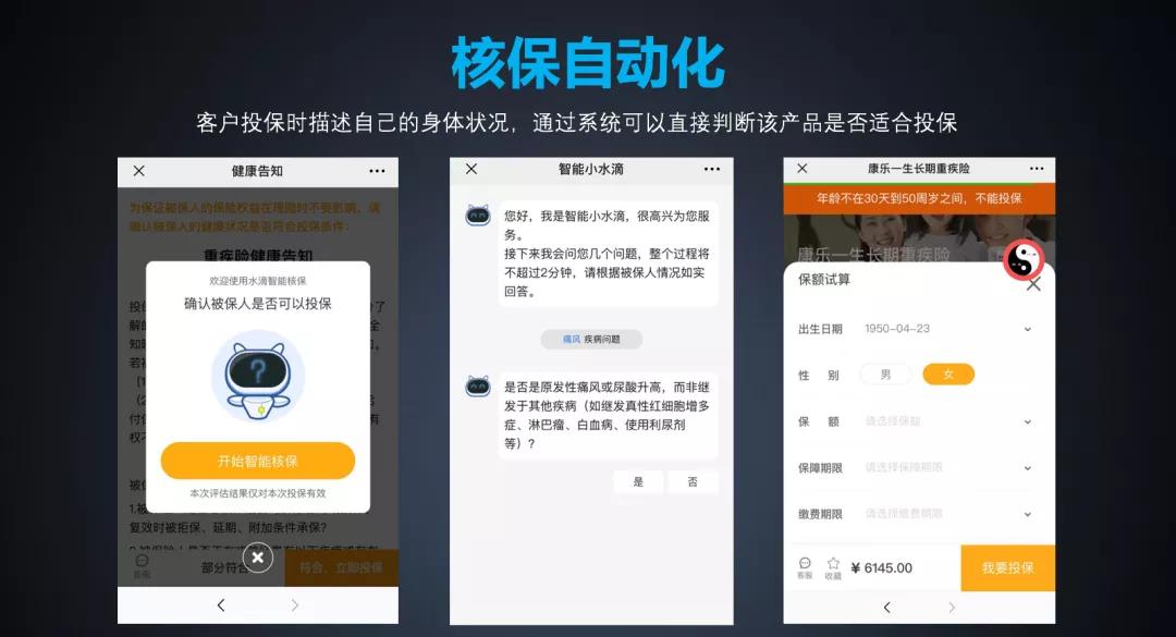 相對於傳統核保,智能核保讓投保更簡單,承保更快捷,過程更人性化,為客户帶來極致體驗。水滴保採用自然語言處理(NLP)能力,通過CONF知識圖譜,支持開放式提問自動識別所諮詢的疾病,並匹配專業核保結果。通過智能規範的核保流程,避免了用户理解偏差,又能通過後台系統的設計,縮短用户核保時間,解決人工核保多次收集資料、重複核保等問題。舉例來説,智能核保通過對每個用户的不同維度信息進行分析,根據分析結果為用户進行個性化的健康告知信息展示;在用户的健康告知信息中存在不符合參保條件的信息的情況下,通過問答交互的方式進一步判斷用户是否滿足參保條件,簡化了重新審核的流程……