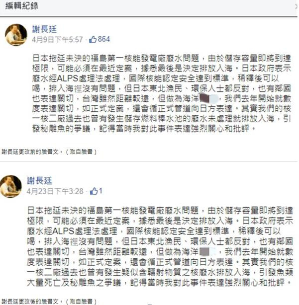 報道稱,黃子哲表示,謝長廷本月9日在臉書發佈的帖文原文是“其實我們的核一核二廠過去也曾有發生‘儲存燃料棒水池的廢水未處理就排放入海’,引發秘雕魚的爭議”,謝長廷把“儲存燃料棒水池的廢水未處理就排放入海”改成“疑似含輻射物質之核廢水排放入海”,這兩件事天差地遠。