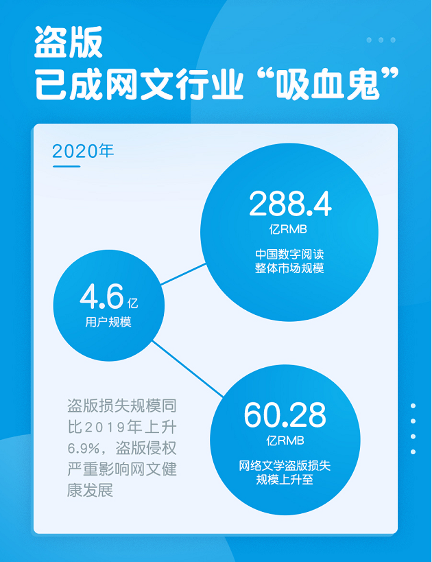 盜版橫行直接給網文行業造成了巨大的損失。4月26日,易觀分析發佈的《中國網絡文學版權保護白皮書》(下文簡稱“《白皮書》”)顯示,2020年中國網絡文學盜版損失規模達60.28億元,同比2019年上升6.9%,新技術濫用、傳播途徑雜多和盜版在全產業鏈實現覆蓋是規模上升的主要因素。