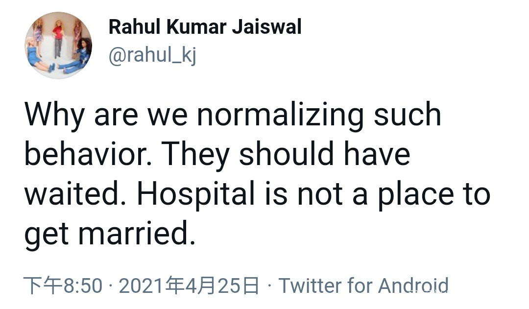 當前,印度各地的疫情形勢都十分嚴峻,社交網絡上,大部分印度網友並未給這對新人送去祝福,而是紛紛質疑為什麼要堅持如期舉辦婚禮:“為什麼要把這種行為正常化呢?他們應該等一等的。醫院不是用來結婚的地方。”