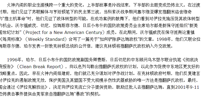 火神內閣的職業生涯橫跨一個重大的變化:上半部故事是冷戰結束,下半部的主題變成恐怖主義。在過渡時期,他們見證了蘇聯解體與亨廷頓筆下的民主第三波,當科索沃戰爭期間塞爾維亞爆發推翻米洛舍維奇的“推土機革命”時,他們見證了政體轉型的可能。在成功案例的鼓舞下,他們看到對伊拉克施壓促其政體轉型的機會。沃爾福威茨、切尼、拉姆斯菲爾德、日後小布什的國防政策委員會主席珀爾都是新保守派組織“新美國世紀計劃”(Project for a New American Century)成員。在此期間,沃爾福威茨在保守派輿論重鎮《每週標準》(Weekly Standard)合寫了一篇關於“如何剷除薩達姆政權”的文章。1998年,他們又聯合拉姆斯菲爾德、珀爾發表一封致克林頓總統的公開信,建議克林頓將推翻薩氏政權納入外交政策。