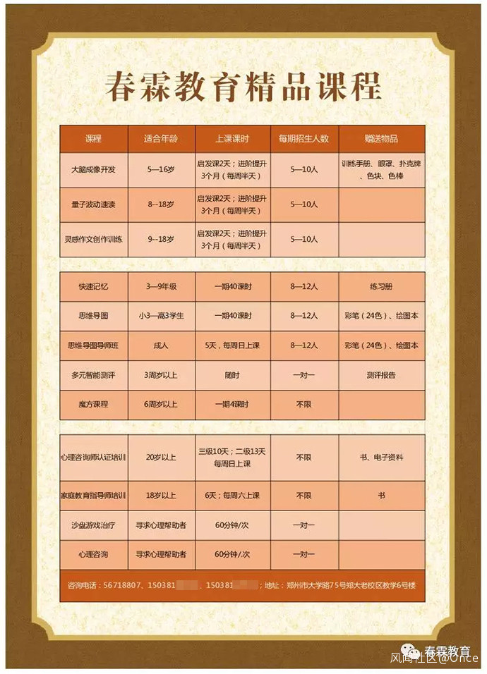 記者查詢發現,“春霖教育”可見的最早文章,發於2014年6月4日。該公眾號內容,多涉親子教育,偶有家庭教育指導師、育嬰師等培訓班的招生、結課消息。培訓地址均在鄭州大學南校區教學6號樓。文章顯示,該校還開有“親密之旅國際頂尖婚姻治療”課程,有時,該校也舉行家庭教育公益課堂。