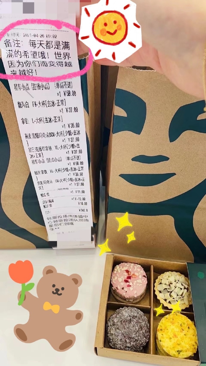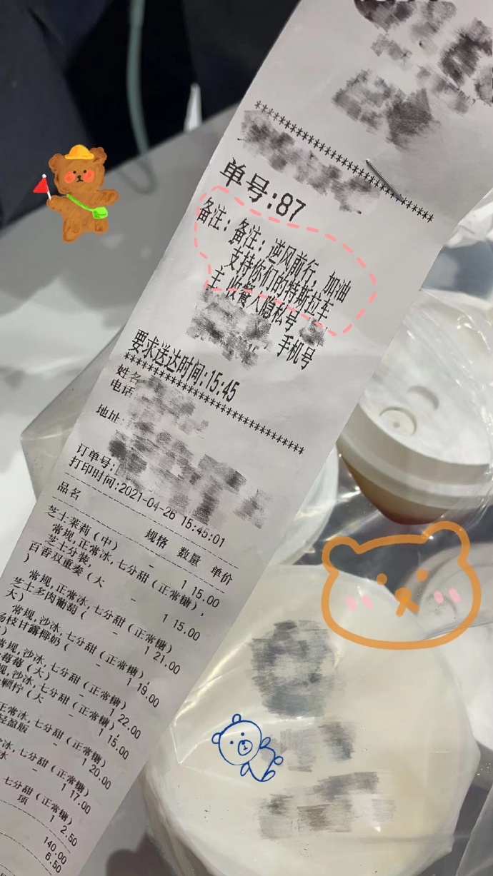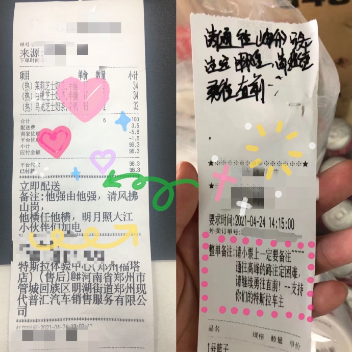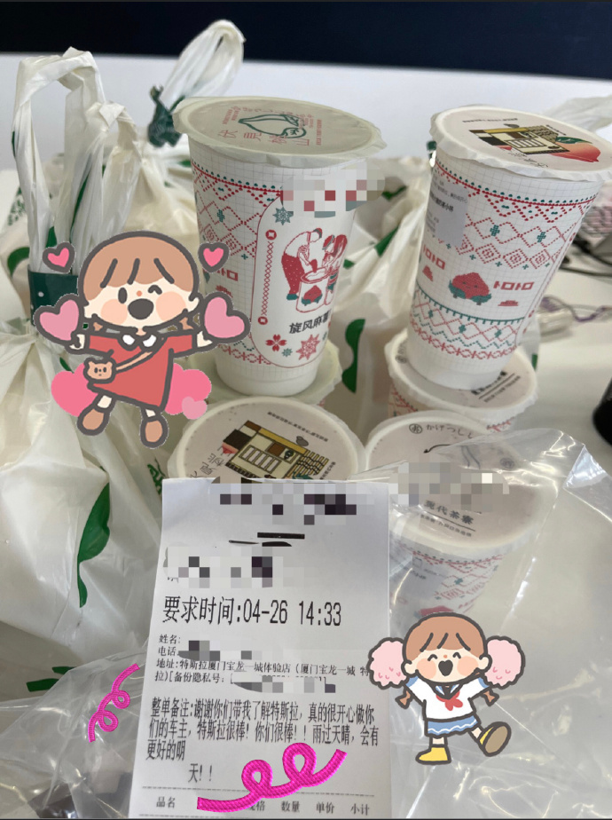 為了證明所言不虛,特斯拉附上了9張他們拍下的車主慰問品圖片。而從這些圖片中可以看到一些寫着“他強由他強、他橫任他橫”、“很開心做你們的車主”、“特斯拉很棒”、“逆風前行”、“加油”、“世界因為你們變得越來越好”等訂單備註,以及對奶茶、咖啡等飲品“少糖”、“七分甜”、“三分糖”、“去冰”的口味要求。