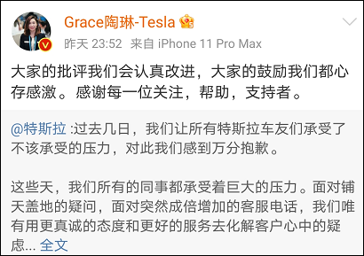 值得一提的是,當日晚,特斯拉全球副總裁陶琳還轉發上述微博並表示,“大家的批評我們會認真改進,大家的鼓勵我們都心存感激。”