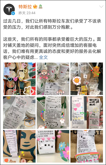 特斯拉官博再發致歉文,開頭就稱,“過去幾日,我們讓所有特斯拉車友們承受了不該承受的壓力,對此我們感到萬分抱歉。”