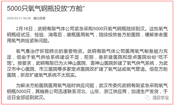 剛才説了,工業氧氣的產能轉化成醫用氧,其中重要的環節就是存儲和運輸,因此2020年2月16日,武鋼氣體緊急採購了5000支氧氣鋼瓶,給沒有液氧站的方艙醫院供氧。