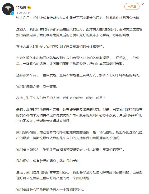 過去幾日,我們讓所有特斯拉車友們承受了不該承受的壓力,對此我們感到萬分抱歉。