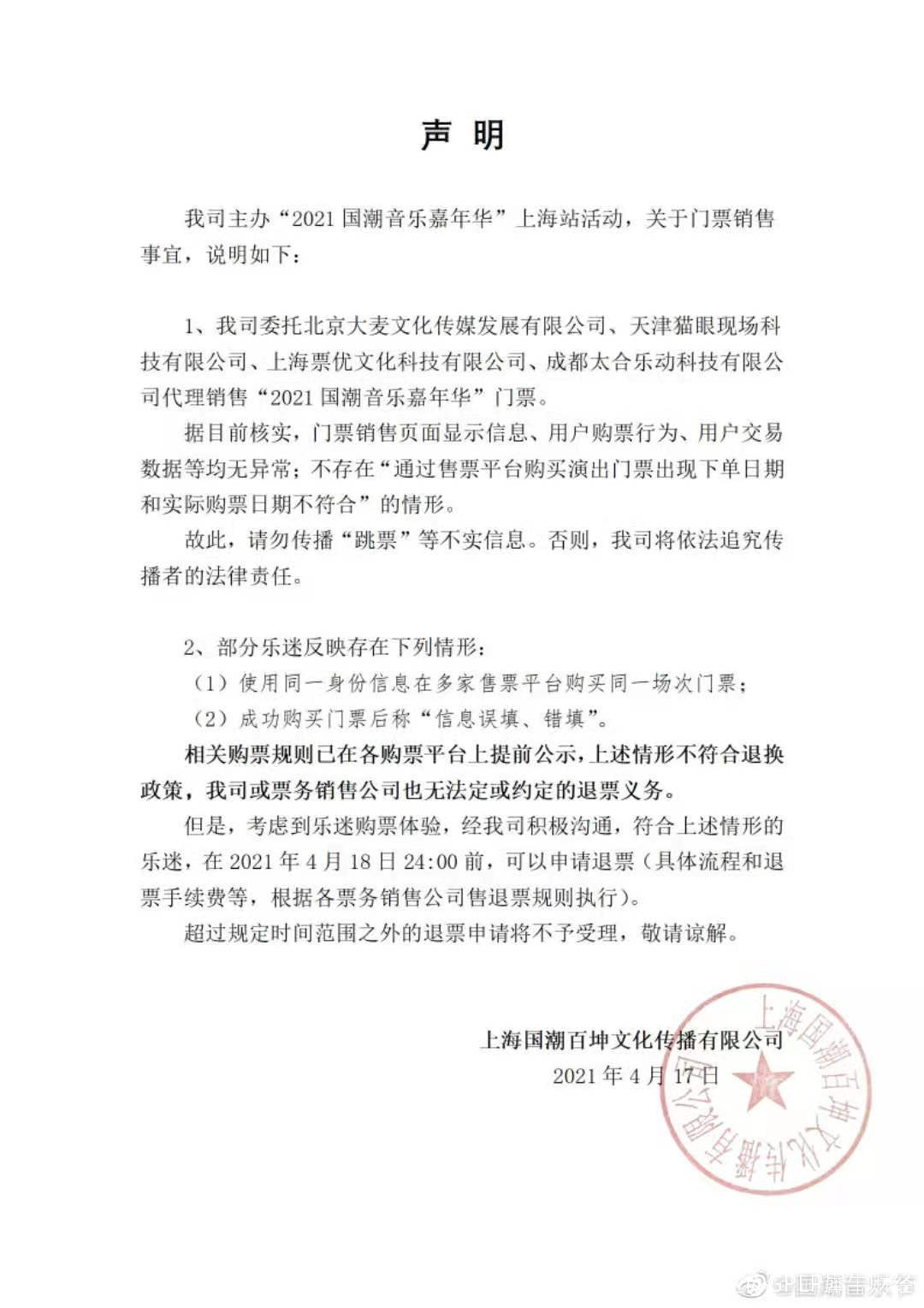然而,事發不久,國潮音樂節官方微博賬號就發佈了聲明,表示主辦方第一時間就與各售票平台進行了溝通,各平台均表示,該項目在售票期間,售票系統一直很穩定,未出現所説的情況,並且同時附上了四家票務平台蓋章的系統自查結果説明函件。主辦方通過微博表示,“請勿傳播‘跳票’等不實信息,否則將依法追究傳播者的法律責任。”