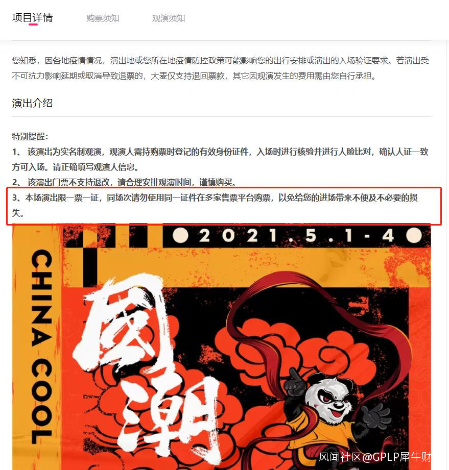 GPLP犀牛財經發現,在黑貓投訴上,演出票不能退引發的投訴量常年居高不下,是一個老問題。經過採訪,發現在這一個過程中,大麥等票務平台扮演的是執行角色,具體項目的退改取決於主辦方,平台則應盡到充分告知的義務,在訂單頁面明確標示退改規則,比如此次國潮音樂節,大麥在商品詳情頁面做了“特別提醒”,告知用户不要用同一證件在多個平台搶票,避免帶來不必要的損失,雖然這一做法仍沒能避免很多用户以一證多票為由要求退票的情況出現。