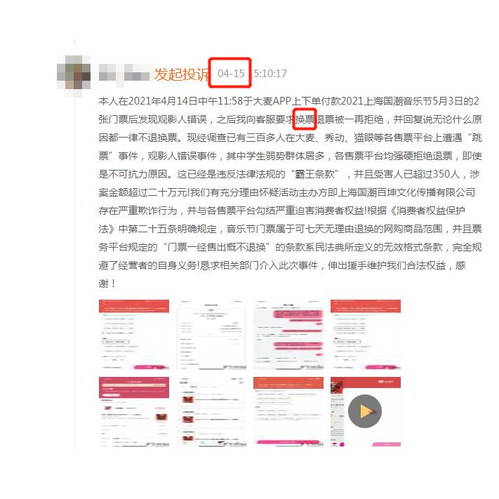 近日有網友爆料,即將於2021年5月1日至5月4日在上海森蘭綠地舉辦的2021國潮音樂節嘉年華上海站,在售票過程中存在“跳票”問題,主要集中在網友本來想買5月4日的票,最終卻發現購買的是5月1日的票,在黑貓投訴平台上,大麥、貓眼、票星球、秀動等多家售票平台同時遭遇了相同的投訴。