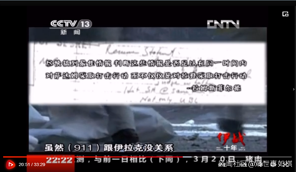 前美國中央情報局反恐中心副主任保羅 比勒説:雖然(911)跟伊拉克沒關係,但它改變了美國民眾的情緒,第一次在政治上有了可能,讓那些本來想開戰的人去挑起戰爭。