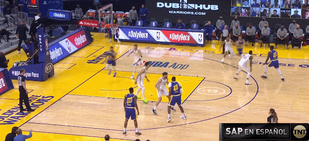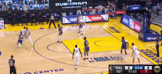 而勇士雖然沒有一上來就完全夾擊東契奇,但是東契奇發動擋拆時,中鋒或者格林還是儘可能地堵突破路線同時向籃下收,這時弱側就得回收護筐。